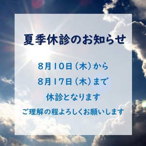 夏季休診のお知らせ [クリニックお知らせ] クリニックお知らせ 2023.08.012025.04.07 今季は8月10日(木)~8月17日(木) 夏季休診とさせていただきます。 ご迷惑をおかけしますが、ご理解の程よろしくお願いいたします。 8月18日(金)から通常診療いたします