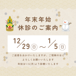 年末年始休診日のおしらせ [クリニックお知らせ] クリニックお知らせ 2024.12.222025.04.07 12月29日(日)〜1月5日(日)の間は年末年始休診日となります。ご迷惑をおかけしますがよろしくお願い致します。 にしさここどもクリニック 院長 西迫 良