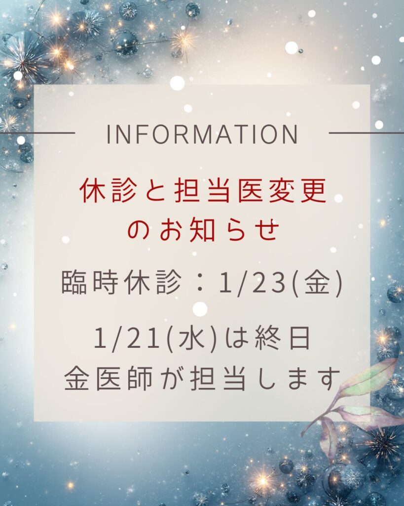 臨時休診と担当医変更のお知らせ クリニックお知らせ 2026.01.04 1月21日(水)は終日金医師が担当いたします。また、1月23日(金)は都合により臨時休診とさせていただきます。 ご迷惑をおかけしますが、ご理解の程よろしくお願いいたします。 にしさここどもクリニック 院長 西迫 良