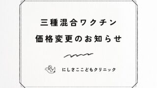 ワクチン情報 3種混合ワクチンの価格が変更となります 3種混合ワクチンの納入価格の大幅な上昇に伴い、やむを得ず価格を改定いたします。2026年4月1日より4,500円より7,500円に値上がりとなります。これまでお勧めしてきたとおり、最も百日咳発症が増加する小学生から高校生までの百日咳発症、重... 2026.03.29 ワクチン情報